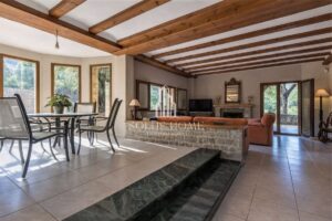✔ Salón principal con chimenea, acceso a porche cubierto de 33 m² y vistas al jardín.