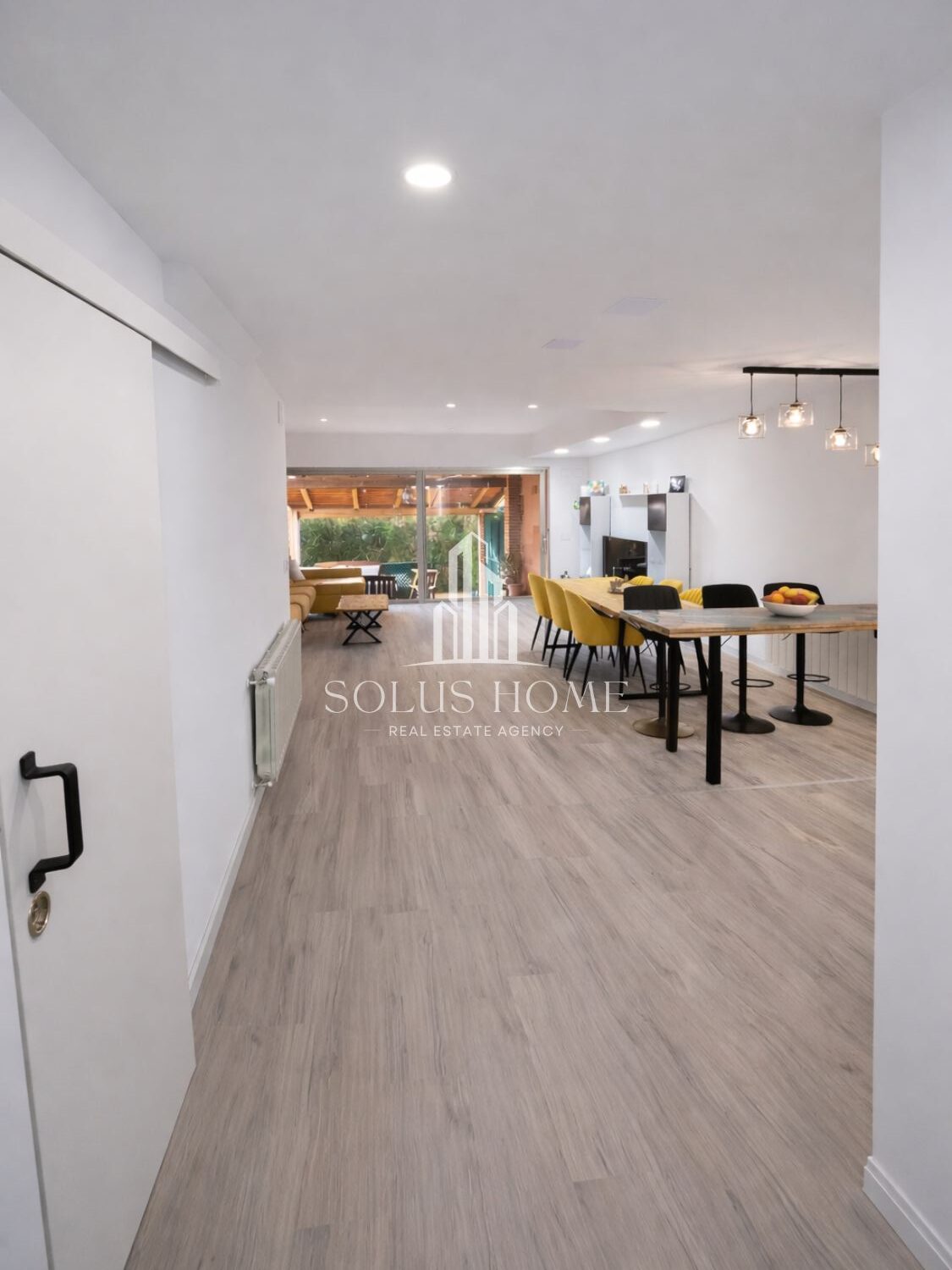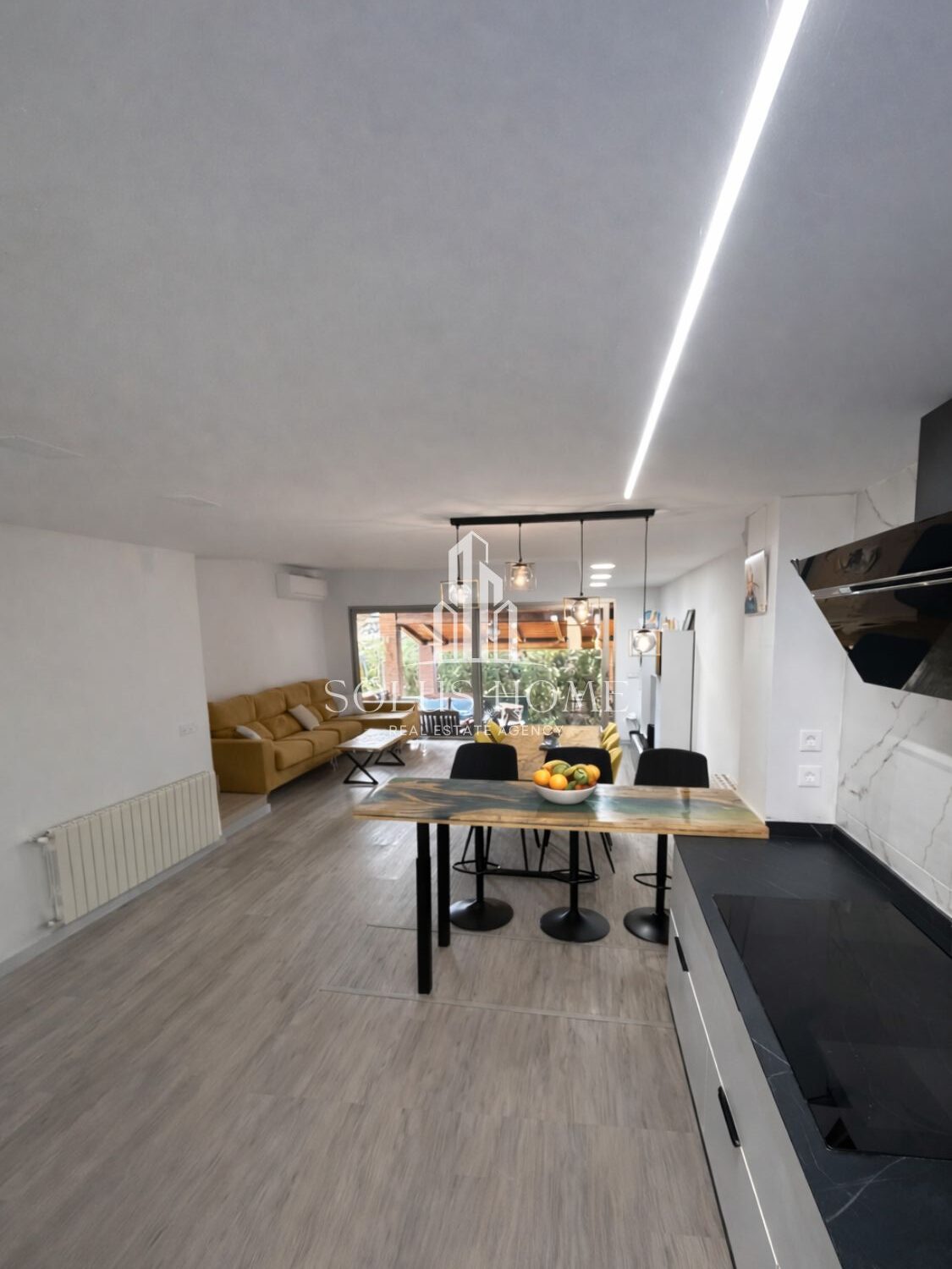 ✔ La planta baja se organiza en un espacio abierto que integra salón, comedor y cocina con grandes puertas correderas de vidrio que conectan directamente con la terraza cubierta y el jardín.